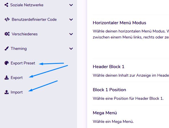 Mit der Import / Export-Funktion können Sie die Settings aus einer Vorlage exportieren und in eine andere Vorlage importieren. Dies ist nützlich, um Ihre Einstellungen zu sichern.